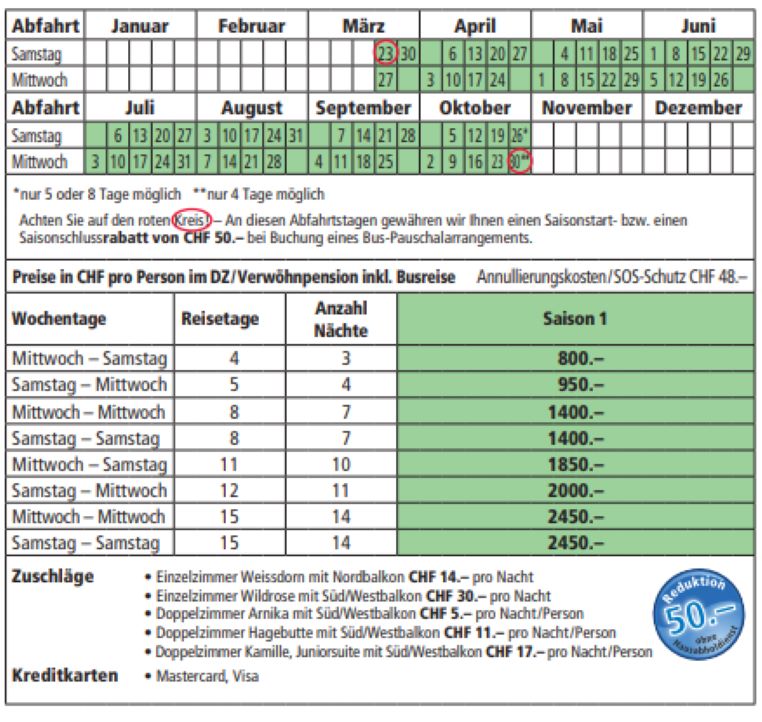 Essen: Verwöhnpension mit Frühstücksbuffet, Mittagssuppe, Nachmittags-Snack und 4-Gang-Abendmenü. Diät: Reduktionskost, Diabeteskost, Magenschonkost, Vollwert- und vegetarische Kost (Diäten) ist mit vorheriger Anmeldung möglich.